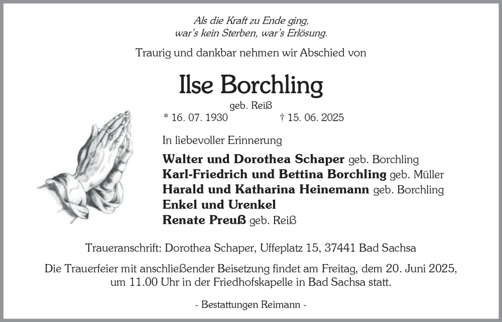 Hier finden Sie alle Traueranzeigen aus der Zeitung, die bisher für Ise Borchling erschienen sind. Weitere Traueranzeigen, die in der Zeitung erscheinen, werden hier ebenfalls aufgelistet