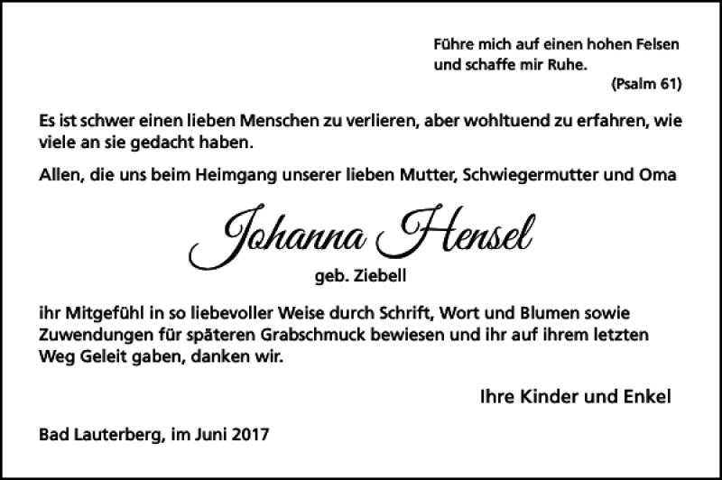 Hier finden Sie alle Traueranzeigen aus der Zeitung, die bisher für Johanna Hensel erschienen sind. Weitere Traueranzeigen, die in der Zeitung erscheinen, werden hier ebenfalls aufgelistet