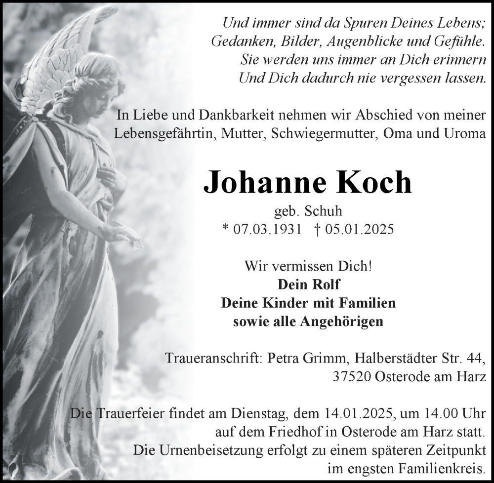 Hier finden Sie alle Traueranzeigen aus der Zeitung, die bisher für Johanne Koch erschienen sind. Weitere Traueranzeigen, die in der Zeitung erscheinen, werden hier ebenfalls aufgelistet