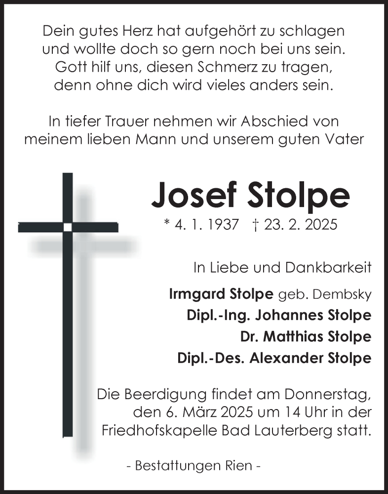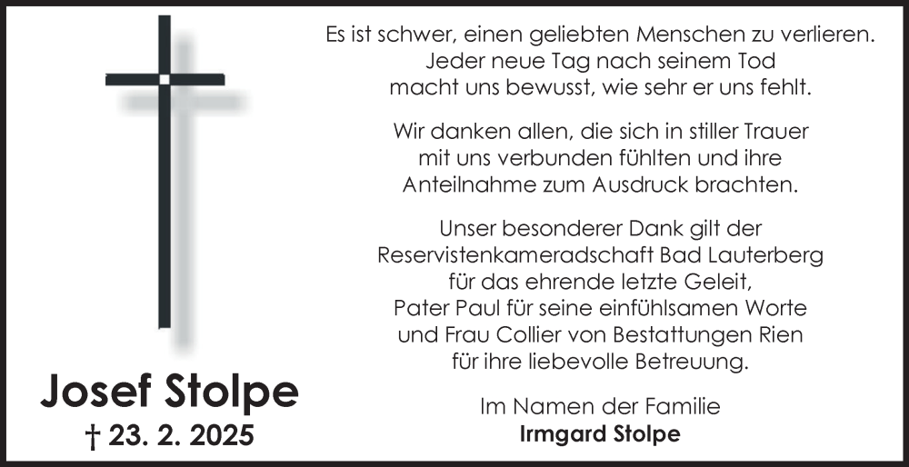 Hier finden Sie alle Traueranzeigen aus der Zeitung, die bisher für Josef Stolpe erschienen sind. Weitere Traueranzeigen, die in der Zeitung erscheinen, werden hier ebenfalls aufgelistet