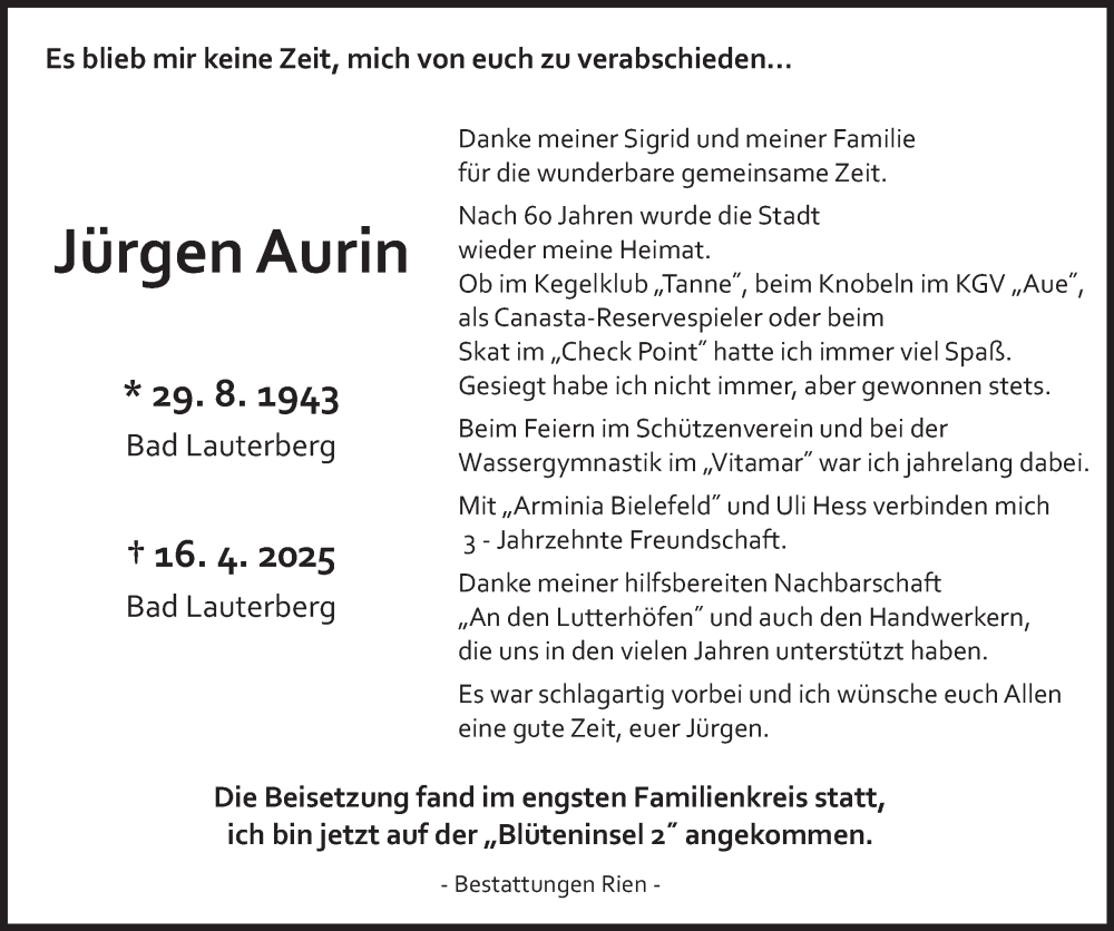 Hier finden Sie alle Traueranzeigen aus der Zeitung, die bisher für Jürgen Aurin erschienen sind. Weitere Traueranzeigen, die in der Zeitung erscheinen, werden hier ebenfalls aufgelistet