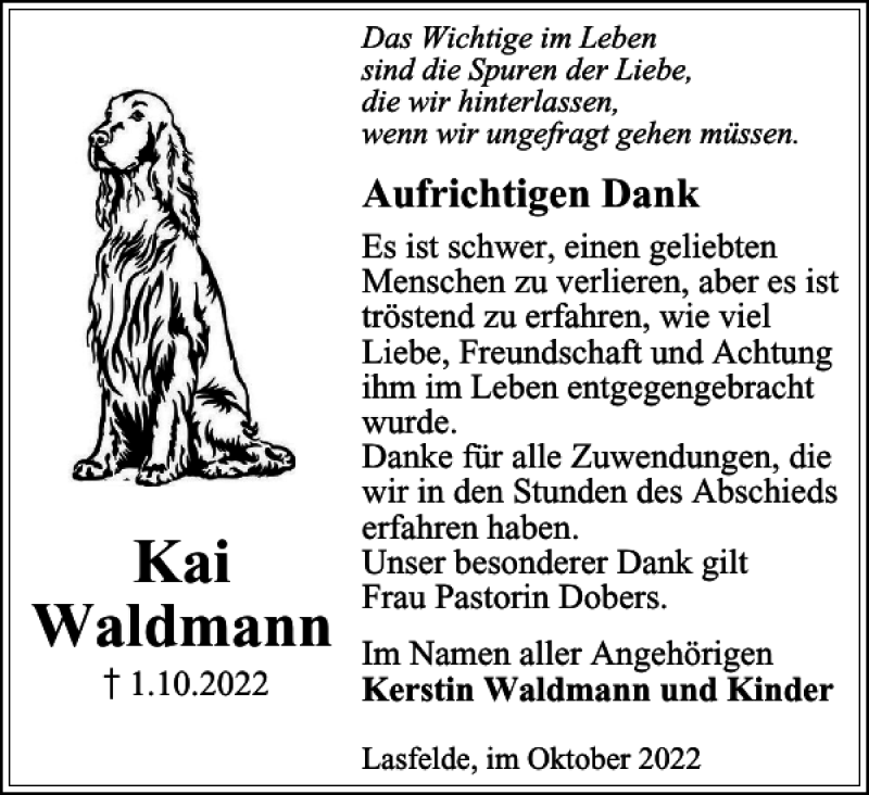 Hier finden Sie alle Traueranzeigen aus der Zeitung, die bisher für Kai Waldmann erschienen sind. Weitere Traueranzeigen, die in der Zeitung erscheinen, werden hier ebenfalls aufgelistet