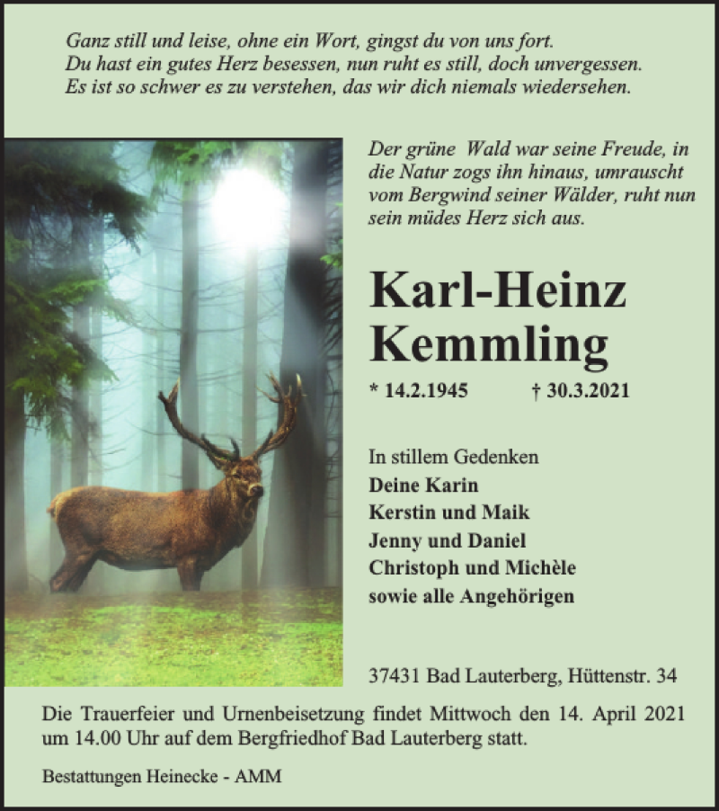 Hier finden Sie alle Traueranzeigen aus der Zeitung, die bisher für Karl-Heinz Kemmling erschienen sind. Weitere Traueranzeigen, die in der Zeitung erscheinen, werden hier ebenfalls aufgelistet