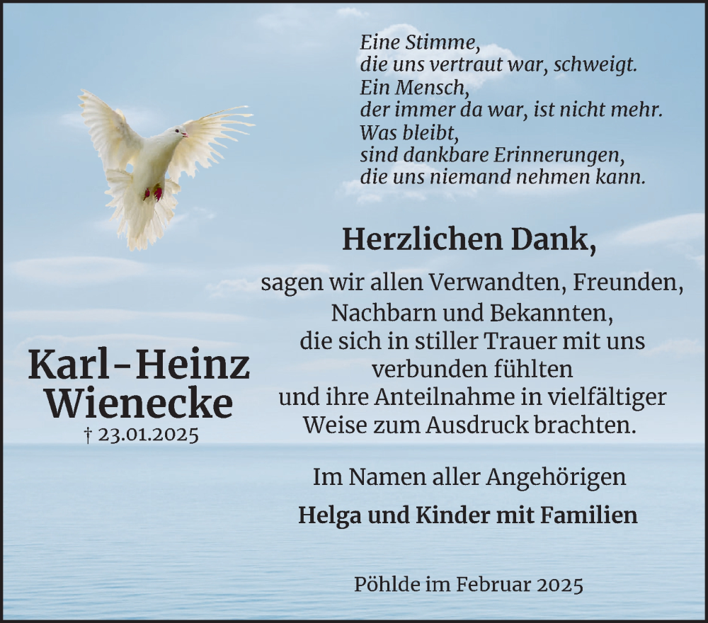Hier finden Sie alle Traueranzeigen aus der Zeitung, die bisher für Karl-Heinz Wienecke erschienen sind. Weitere Traueranzeigen, die in der Zeitung erscheinen, werden hier ebenfalls aufgelistet