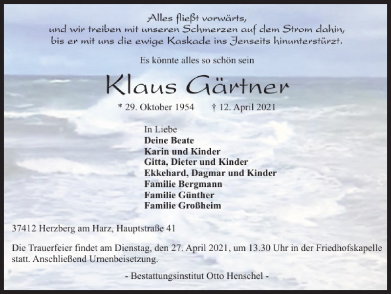Hier finden Sie alle Traueranzeigen aus der Zeitung, die bisher für Klaus Gärtner erschienen sind. Weitere Traueranzeigen, die in der Zeitung erscheinen, werden hier ebenfalls aufgelistet