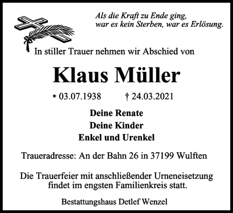 Hier finden Sie alle Traueranzeigen aus der Zeitung, die bisher für Klaus Müller erschienen sind. Weitere Traueranzeigen, die in der Zeitung erscheinen, werden hier ebenfalls aufgelistet