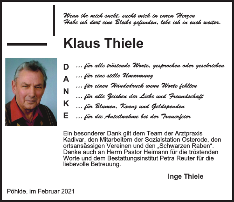Hier finden Sie alle Traueranzeigen aus der Zeitung, die bisher für Klaus Thiele erschienen sind. Weitere Traueranzeigen, die in der Zeitung erscheinen, werden hier ebenfalls aufgelistet