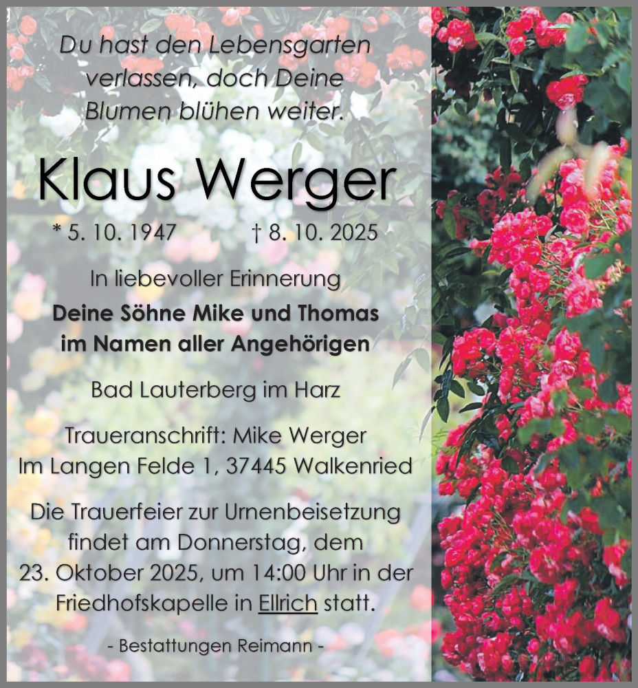 Hier finden Sie alle Traueranzeigen aus der Zeitung, die bisher für Klaus Werger erschienen sind. Weitere Traueranzeigen, die in der Zeitung erscheinen, werden hier ebenfalls aufgelistet