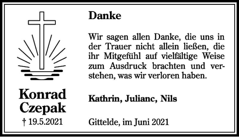 Hier finden Sie alle Traueranzeigen aus der Zeitung, die bisher für Konrad Czepak erschienen sind. Weitere Traueranzeigen, die in der Zeitung erscheinen, werden hier ebenfalls aufgelistet