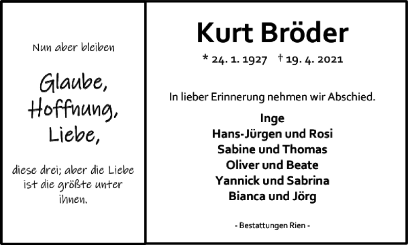Hier finden Sie alle Traueranzeigen aus der Zeitung, die bisher für Kurt Bröder erschienen sind. Weitere Traueranzeigen, die in der Zeitung erscheinen, werden hier ebenfalls aufgelistet