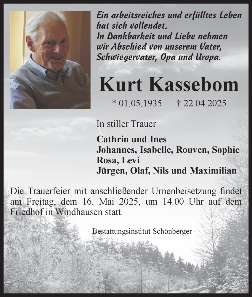 Hier finden Sie alle Traueranzeigen aus der Zeitung, die bisher für Kurt Kassebom erschienen sind. Weitere Traueranzeigen, die in der Zeitung erscheinen, werden hier ebenfalls aufgelistet