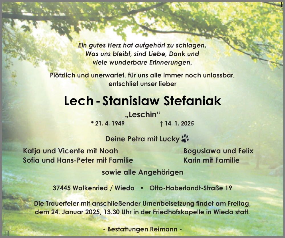 Hier finden Sie alle Traueranzeigen aus der Zeitung, die bisher für Lech-Stanislaw Stefaniak erschienen sind. Weitere Traueranzeigen, die in der Zeitung erscheinen, werden hier ebenfalls aufgelistet