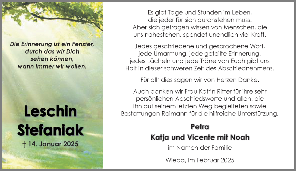 Hier finden Sie alle Traueranzeigen aus der Zeitung, die bisher für Leschin Stefaniak erschienen sind. Weitere Traueranzeigen, die in der Zeitung erscheinen, werden hier ebenfalls aufgelistet