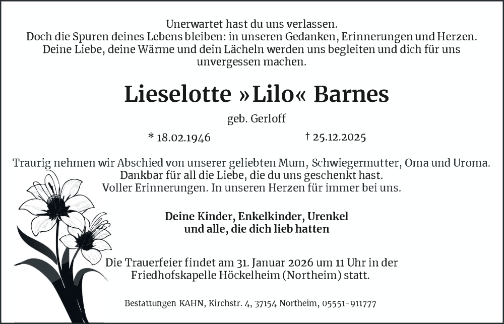 Hier finden Sie alle Traueranzeigen aus der Zeitung, die bisher für Lieselotte Barnes erschienen sind. Weitere Traueranzeigen, die in der Zeitung erscheinen, werden hier ebenfalls aufgelistet