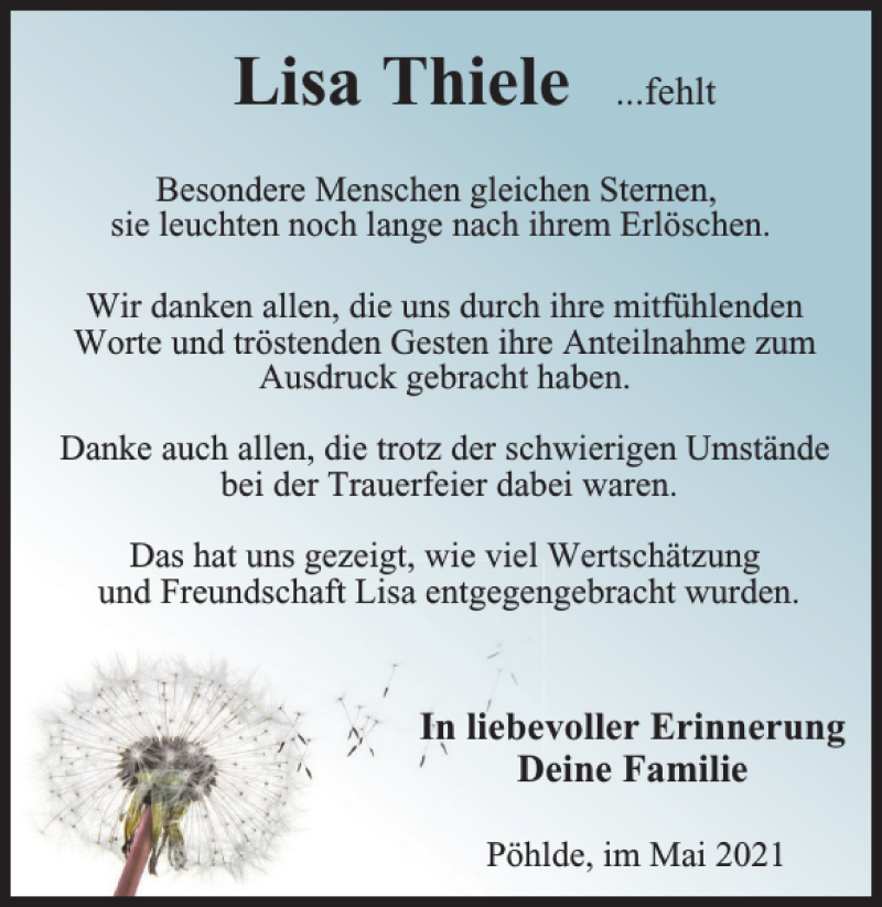 Hier finden Sie alle Traueranzeigen aus der Zeitung, die bisher für Lisa Thiele erschienen sind. Weitere Traueranzeigen, die in der Zeitung erscheinen, werden hier ebenfalls aufgelistet