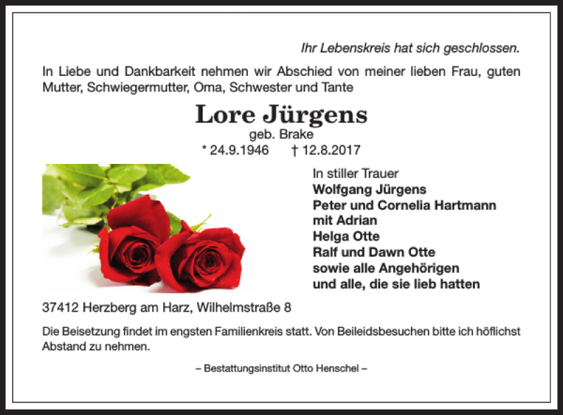 Hier finden Sie alle Traueranzeigen aus der Zeitung, die bisher für Lore Jürgens erschienen sind. Weitere Traueranzeigen, die in der Zeitung erscheinen, werden hier ebenfalls aufgelistet