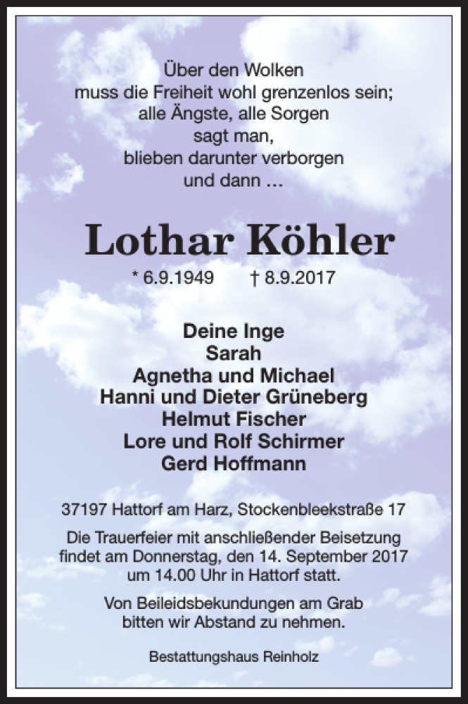 Hier finden Sie alle Traueranzeigen aus der Zeitung, die bisher für Lothar Köhler erschienen sind. Weitere Traueranzeigen, die in der Zeitung erscheinen, werden hier ebenfalls aufgelistet