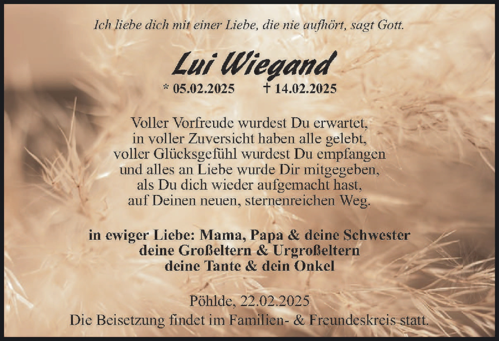 Hier finden Sie alle Traueranzeigen aus der Zeitung, die bisher für Lui Wiegand erschienen sind. Weitere Traueranzeigen, die in der Zeitung erscheinen, werden hier ebenfalls aufgelistet