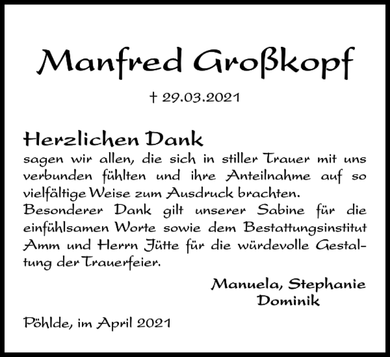 Hier finden Sie alle Traueranzeigen aus der Zeitung, die bisher für Manfred Großkopf erschienen sind. Weitere Traueranzeigen, die in der Zeitung erscheinen, werden hier ebenfalls aufgelistet