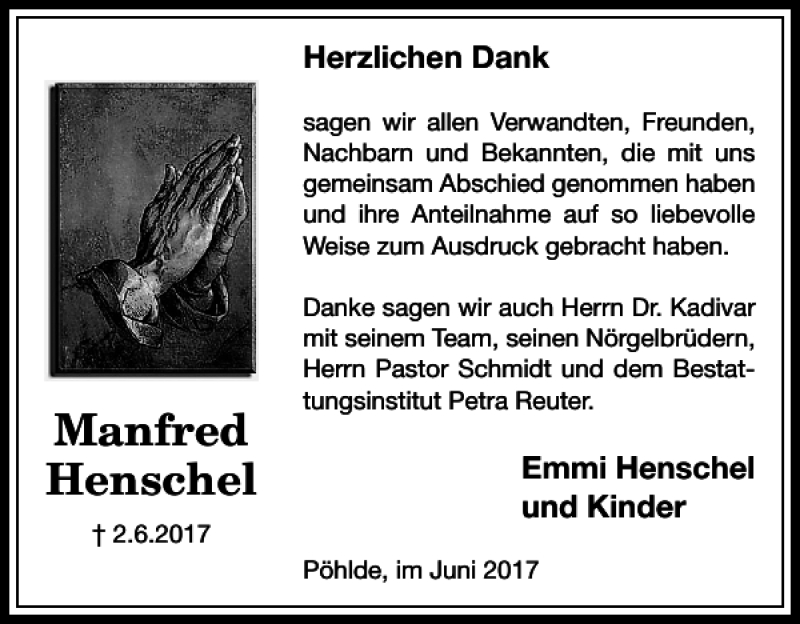Hier finden Sie alle Traueranzeigen aus der Zeitung, die bisher für Manfred Henschel erschienen sind. Weitere Traueranzeigen, die in der Zeitung erscheinen, werden hier ebenfalls aufgelistet