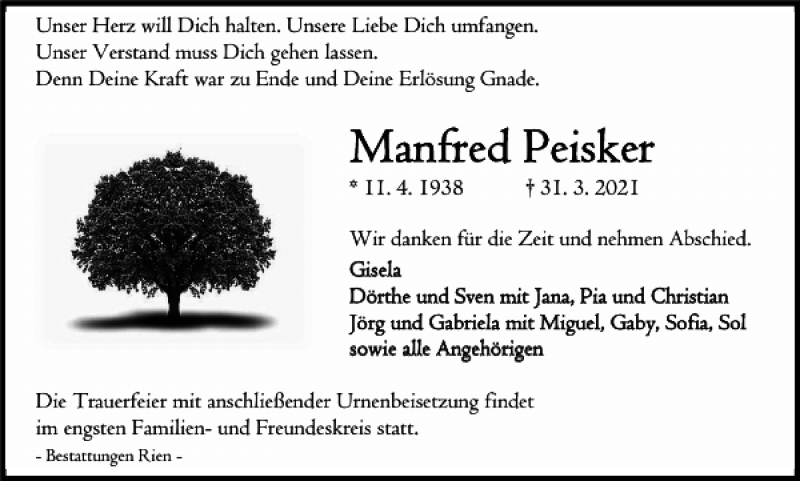 Hier finden Sie alle Traueranzeigen aus der Zeitung, die bisher für Manfred Peisker erschienen sind. Weitere Traueranzeigen, die in der Zeitung erscheinen, werden hier ebenfalls aufgelistet