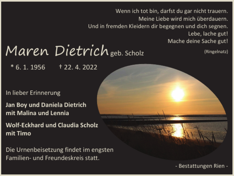 Hier finden Sie alle Traueranzeigen aus der Zeitung, die bisher für Maren Dietrich erschienen sind. Weitere Traueranzeigen, die in der Zeitung erscheinen, werden hier ebenfalls aufgelistet