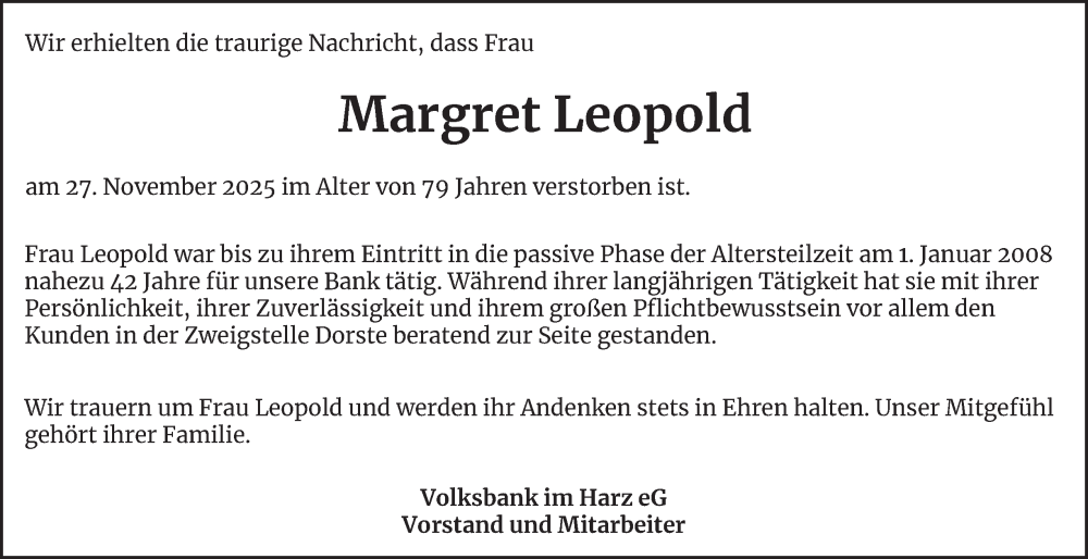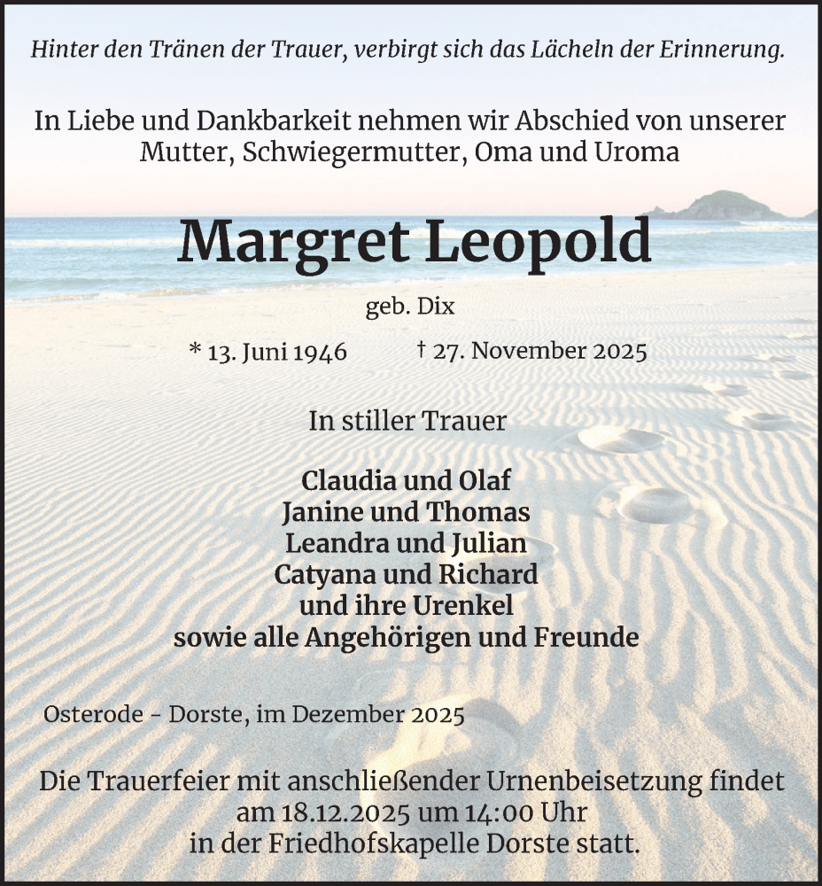 Hier finden Sie alle Traueranzeigen aus der Zeitung, die bisher für Margret Leopold erschienen sind. Weitere Traueranzeigen, die in der Zeitung erscheinen, werden hier ebenfalls aufgelistet