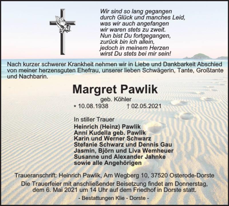 Hier finden Sie alle Traueranzeigen aus der Zeitung, die bisher für Margret Pawlik erschienen sind. Weitere Traueranzeigen, die in der Zeitung erscheinen, werden hier ebenfalls aufgelistet