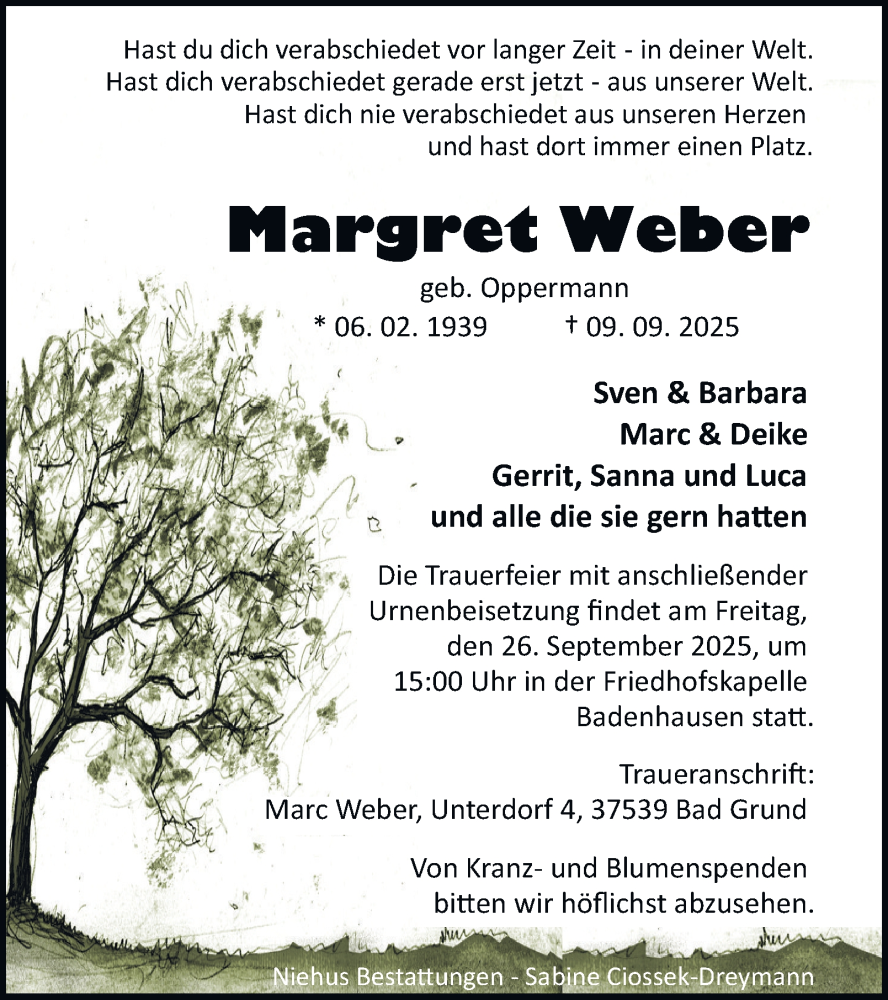 Hier finden Sie alle Traueranzeigen aus der Zeitung, die bisher für Margret Weber erschienen sind. Weitere Traueranzeigen, die in der Zeitung erscheinen, werden hier ebenfalls aufgelistet