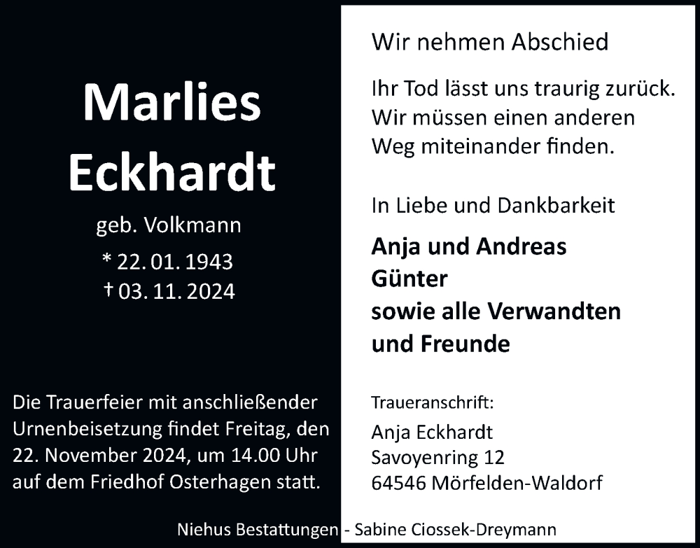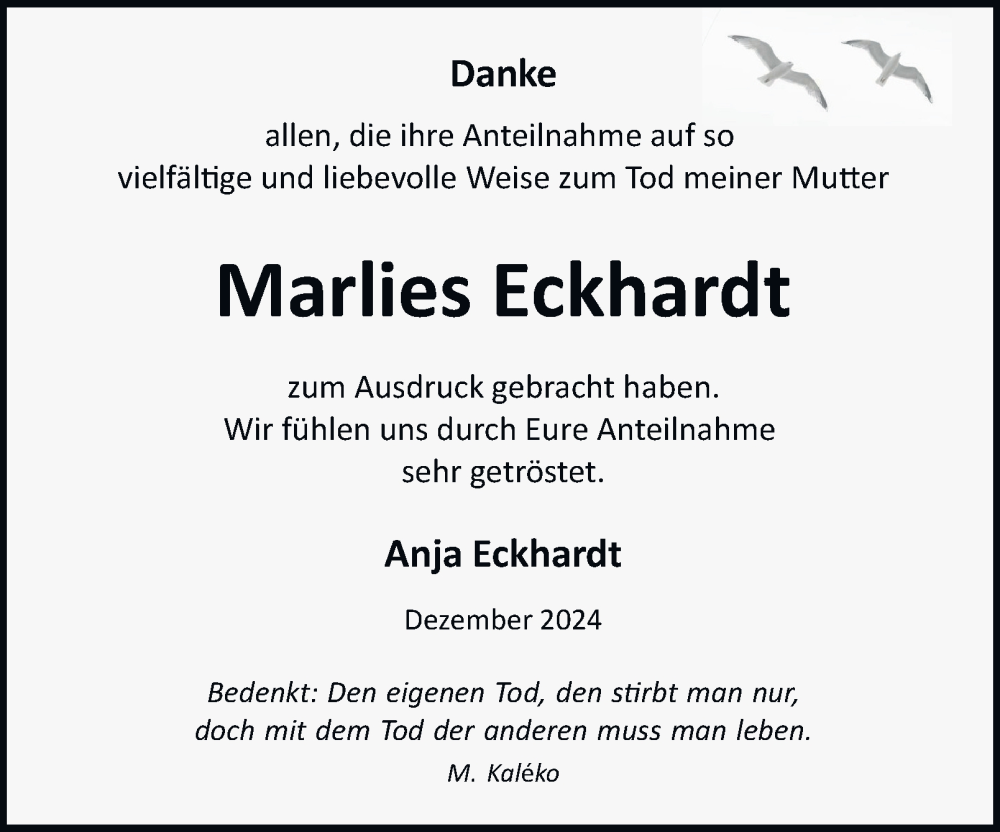 Hier finden Sie alle Traueranzeigen aus der Zeitung, die bisher für Marlies Eckhardt erschienen sind. Weitere Traueranzeigen, die in der Zeitung erscheinen, werden hier ebenfalls aufgelistet