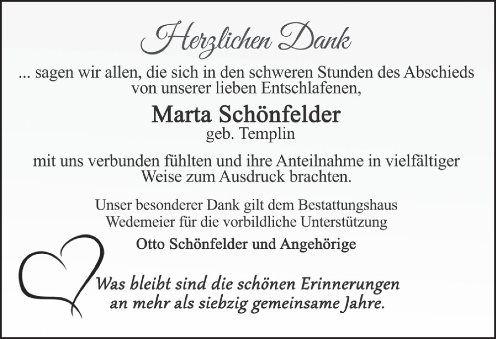 Hier finden Sie alle Traueranzeigen aus der Zeitung, die bisher für Marta Schönfelder erschienen sind. Weitere Traueranzeigen, die in der Zeitung erscheinen, werden hier ebenfalls aufgelistet