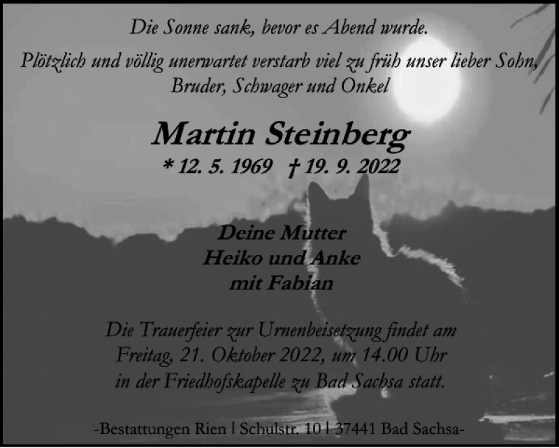 Hier finden Sie alle Traueranzeigen aus der Zeitung, die bisher für Martin Steinberg erschienen sind. Weitere Traueranzeigen, die in der Zeitung erscheinen, werden hier ebenfalls aufgelistet