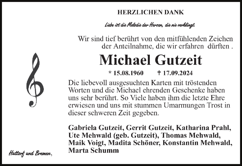 Hier finden Sie alle Traueranzeigen aus der Zeitung, die bisher für Michael Gutzeit erschienen sind. Weitere Traueranzeigen, die in der Zeitung erscheinen, werden hier ebenfalls aufgelistet