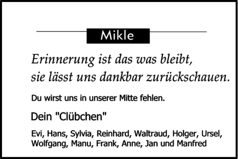 Hier finden Sie alle Traueranzeigen aus der Zeitung, die bisher für Mikle erschienen sind. Weitere Traueranzeigen, die in der Zeitung erscheinen, werden hier ebenfalls aufgelistet