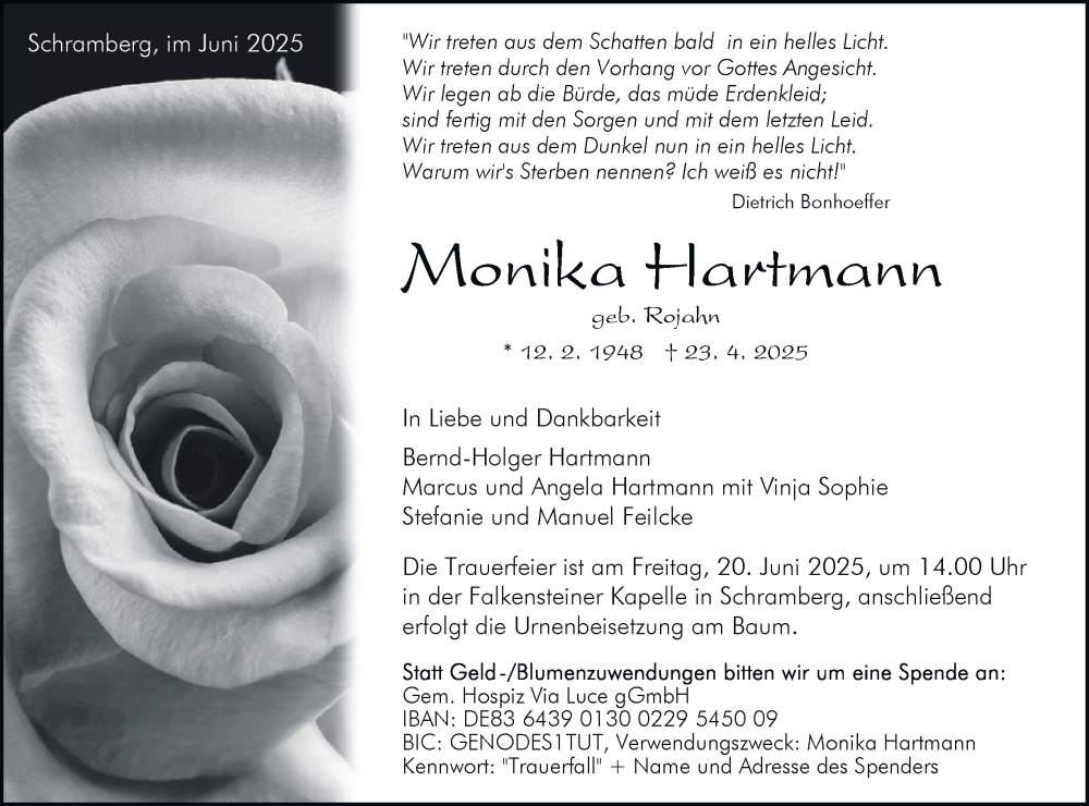 Hier finden Sie alle Traueranzeigen aus der Zeitung, die bisher für Monika Hartmann erschienen sind. Weitere Traueranzeigen, die in der Zeitung erscheinen, werden hier ebenfalls aufgelistet