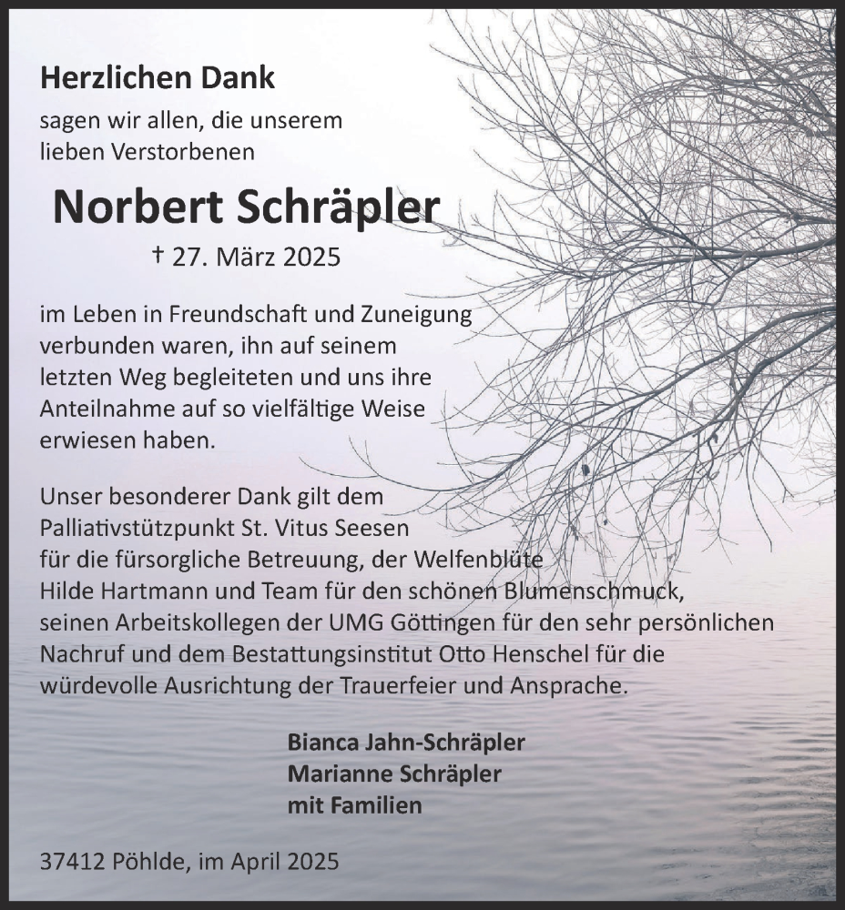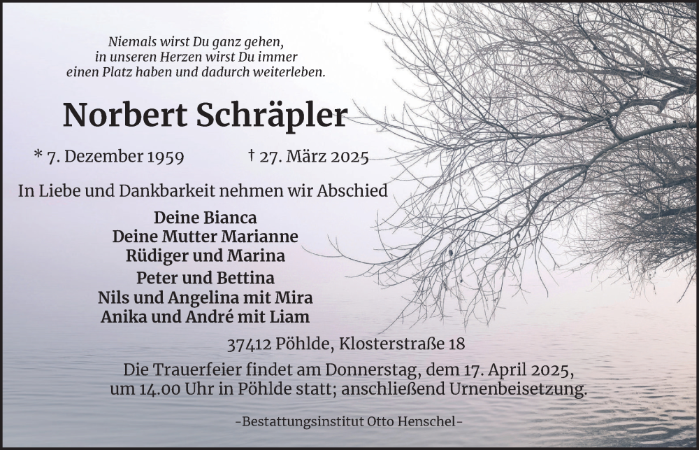 Hier finden Sie alle Traueranzeigen aus der Zeitung, die bisher für Norbert Schräpler erschienen sind. Weitere Traueranzeigen, die in der Zeitung erscheinen, werden hier ebenfalls aufgelistet