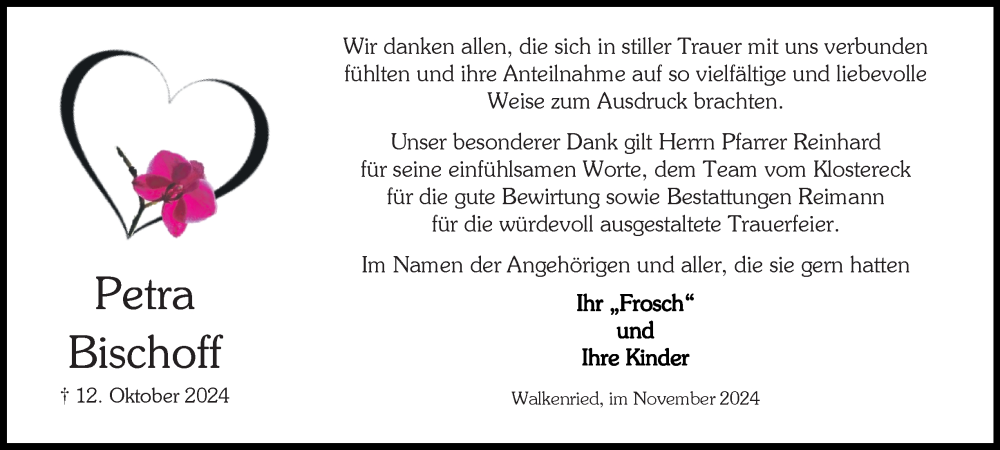 Hier finden Sie alle Traueranzeigen aus der Zeitung, die bisher für Petra Bischoff erschienen sind. Weitere Traueranzeigen, die in der Zeitung erscheinen, werden hier ebenfalls aufgelistet