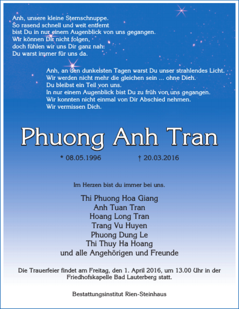 Hier finden Sie alle Traueranzeigen aus der Zeitung, die bisher für Phuong Anh Tran erschienen sind. Weitere Traueranzeigen, die in der Zeitung erscheinen, werden hier ebenfalls aufgelistet