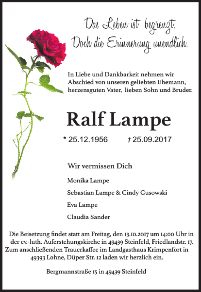 Hier finden Sie alle Traueranzeigen aus der Zeitung, die bisher für Ralf Lampe erschienen sind. Weitere Traueranzeigen, die in der Zeitung erscheinen, werden hier ebenfalls aufgelistet
