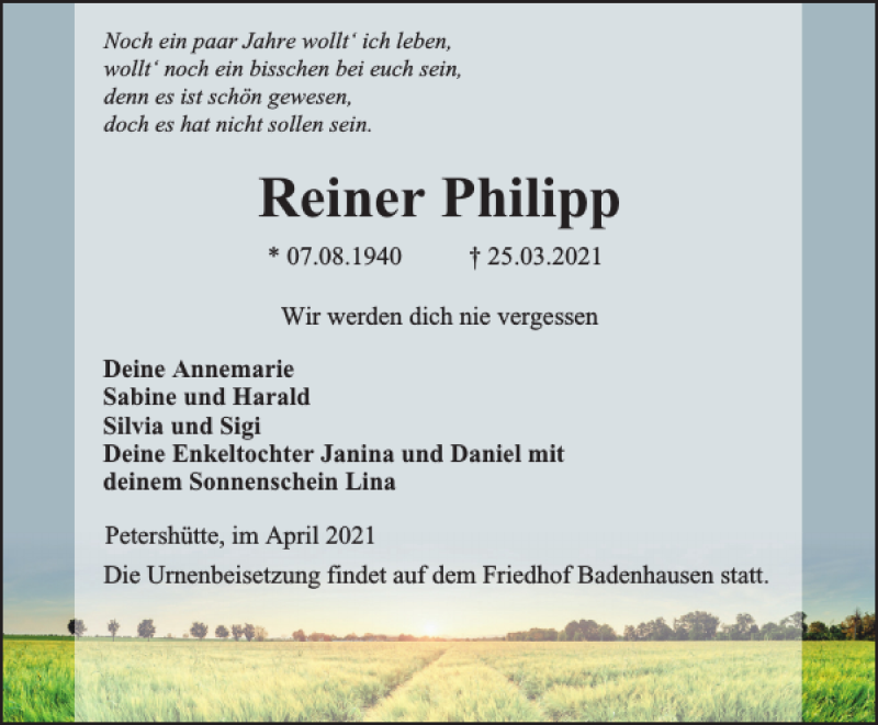 Hier finden Sie alle Traueranzeigen aus der Zeitung, die bisher für Reiner Philipp erschienen sind. Weitere Traueranzeigen, die in der Zeitung erscheinen, werden hier ebenfalls aufgelistet