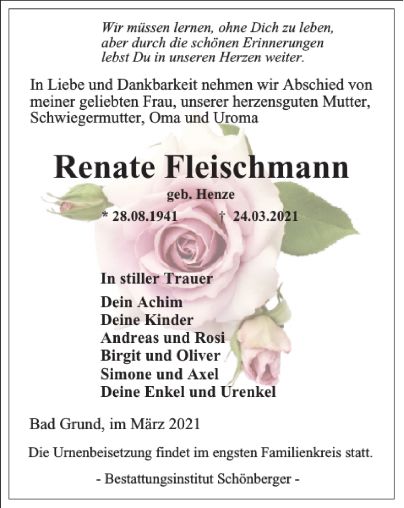 Hier finden Sie alle Traueranzeigen aus der Zeitung, die bisher für Renate Fleischmann erschienen sind. Weitere Traueranzeigen, die in der Zeitung erscheinen, werden hier ebenfalls aufgelistet