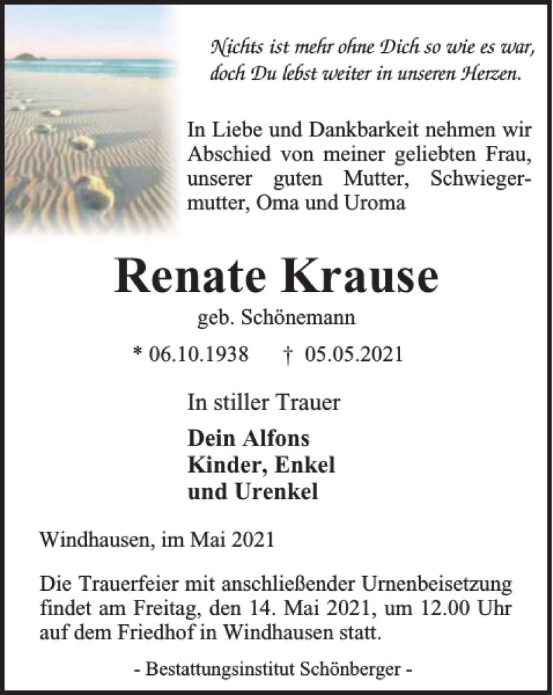 Hier finden Sie alle Traueranzeigen aus der Zeitung, die bisher für Renate Krause erschienen sind. Weitere Traueranzeigen, die in der Zeitung erscheinen, werden hier ebenfalls aufgelistet