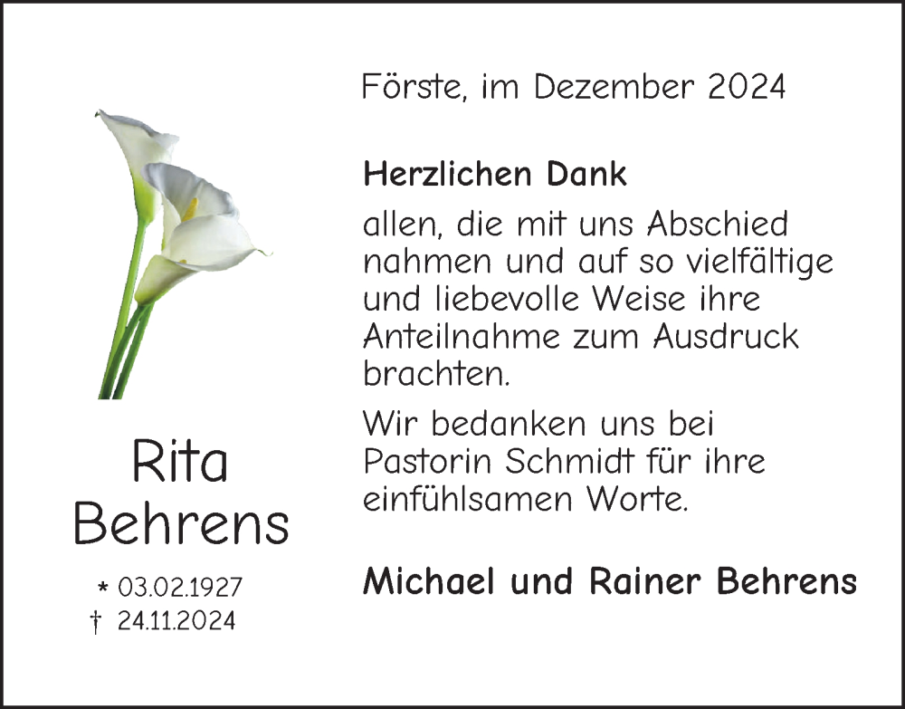 Hier finden Sie alle Traueranzeigen aus der Zeitung, die bisher für Rita Behrens erschienen sind. Weitere Traueranzeigen, die in der Zeitung erscheinen, werden hier ebenfalls aufgelistet
