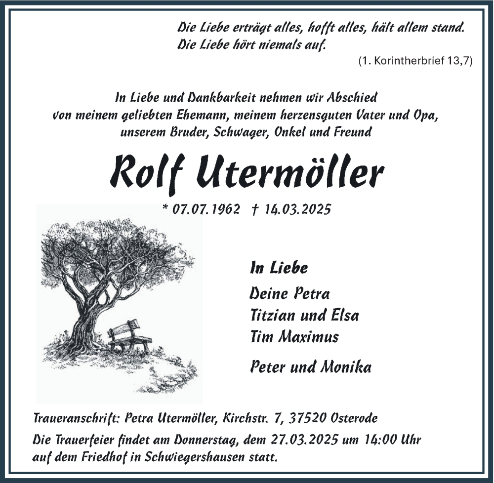Hier finden Sie alle Traueranzeigen aus der Zeitung, die bisher für Rolf Utermöller erschienen sind. Weitere Traueranzeigen, die in der Zeitung erscheinen, werden hier ebenfalls aufgelistet