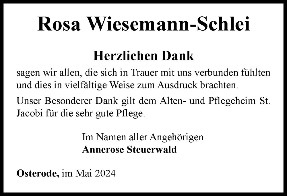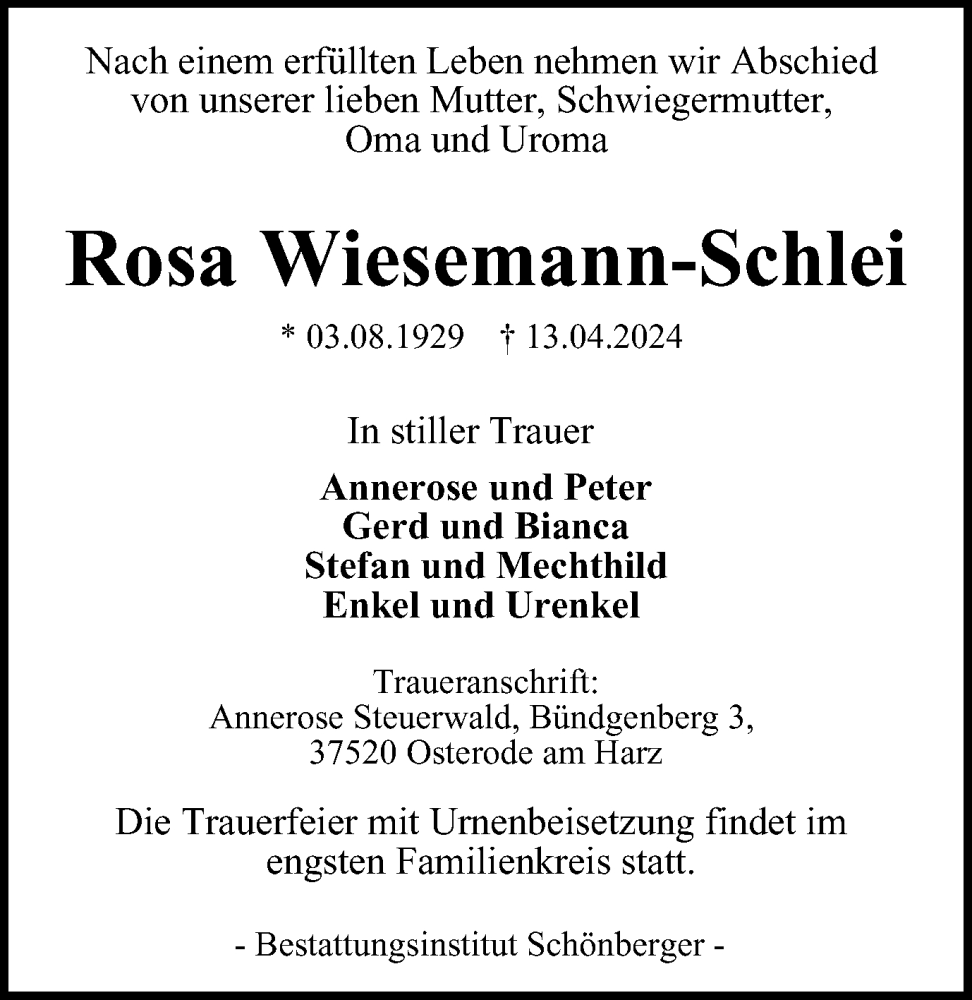 Hier finden Sie alle Traueranzeigen aus der Zeitung, die bisher für Rosa Wiesemann-Schlei erschienen sind. Weitere Traueranzeigen, die in der Zeitung erscheinen, werden hier ebenfalls aufgelistet