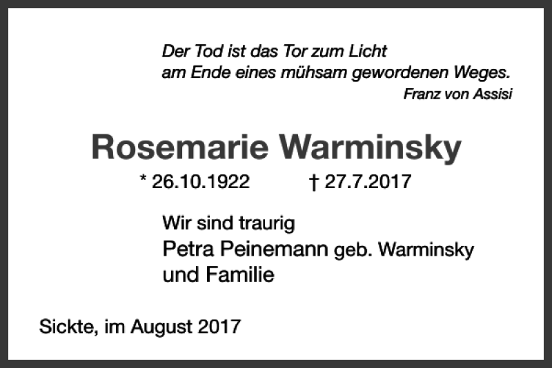 Hier finden Sie alle Traueranzeigen aus der Zeitung, die bisher für Rosemarie Warminsky erschienen sind. Weitere Traueranzeigen, die in der Zeitung erscheinen, werden hier ebenfalls aufgelistet
