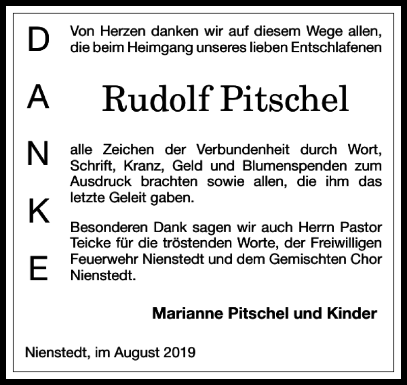 Hier finden Sie alle Traueranzeigen aus der Zeitung, die bisher für Rudolf Pitschel erschienen sind. Weitere Traueranzeigen, die in der Zeitung erscheinen, werden hier ebenfalls aufgelistet