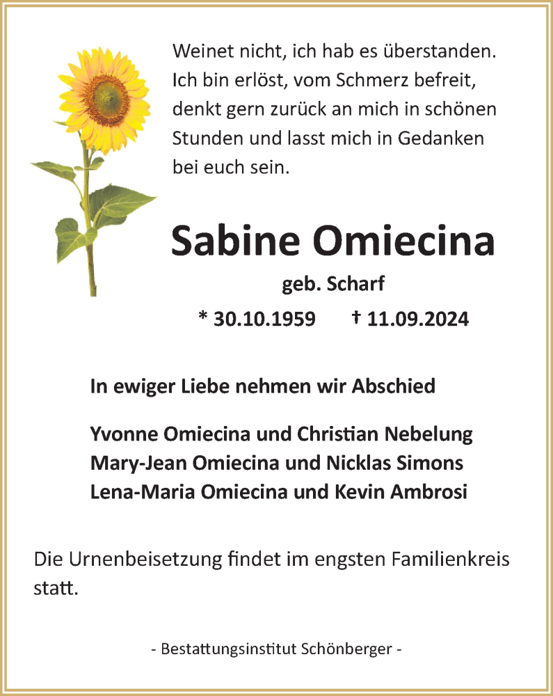 Hier finden Sie alle Traueranzeigen aus der Zeitung, die bisher für Sabine Omiecina erschienen sind. Weitere Traueranzeigen, die in der Zeitung erscheinen, werden hier ebenfalls aufgelistet