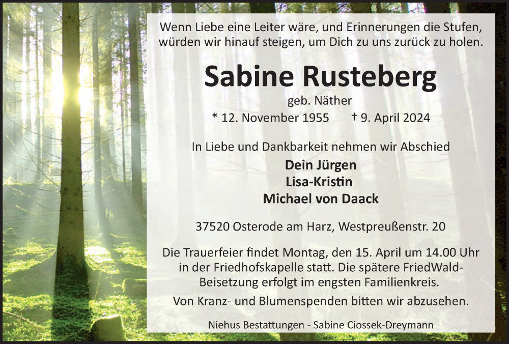 Hier finden Sie alle Traueranzeigen aus der Zeitung, die bisher für Sabine Rusteberg erschienen sind. Weitere Traueranzeigen, die in der Zeitung erscheinen, werden hier ebenfalls aufgelistet