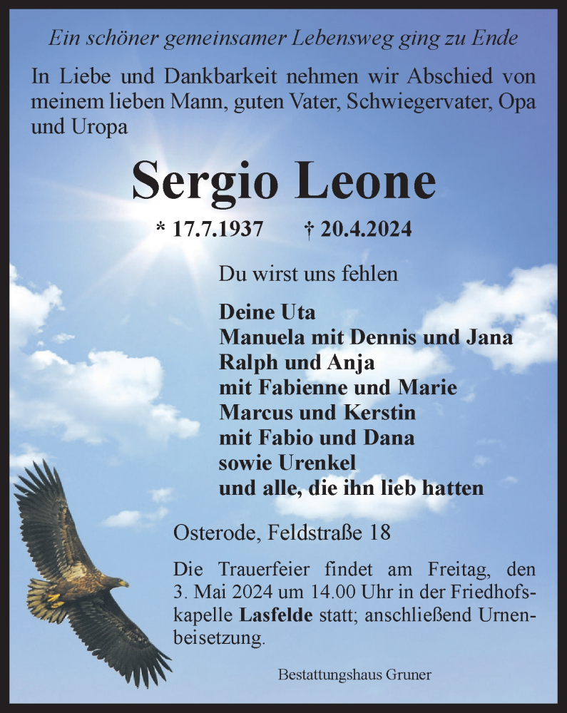 Hier finden Sie alle Traueranzeigen aus der Zeitung, die bisher für Sergio Leone erschienen sind. Weitere Traueranzeigen, die in der Zeitung erscheinen, werden hier ebenfalls aufgelistet